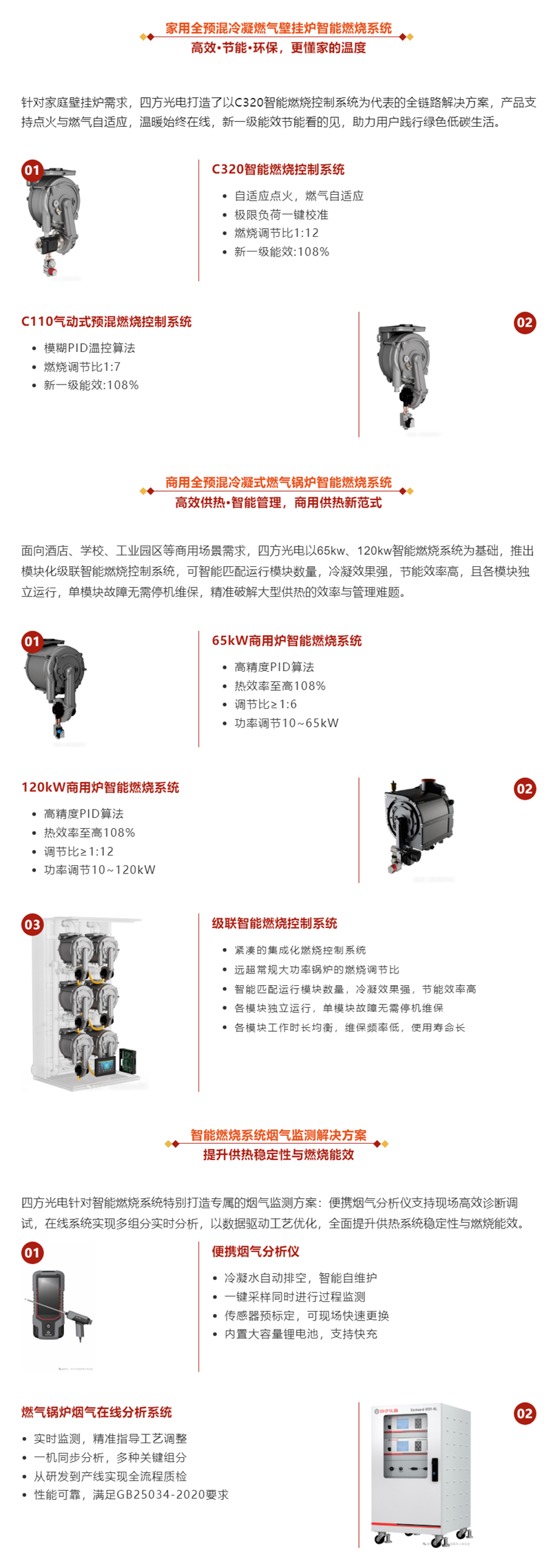 作为技术领先的智能燃烧系统全供应链产品开发和制造商,四方光电将携家用&商用全预混冷凝式智能燃烧系统全套解决方案、智能燃烧系统烟气监测解决方案登场,以领先技术和创新产品为供热产业绿色升级和节能降碳注入新动能。