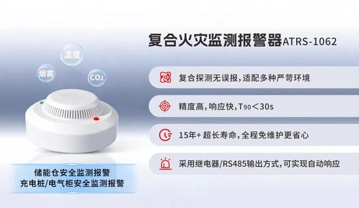 复合探测:四方光电展出新品复合火灾监测报警器ATRS-1062,融合NDIR、光散射及NTC补偿技术,可对烟雾浓度、CO₂浓度、温度实现高精度复合探测,有效过滤环境干扰,消除了单参数误报的痛点,大幅提升系统的响应速率。