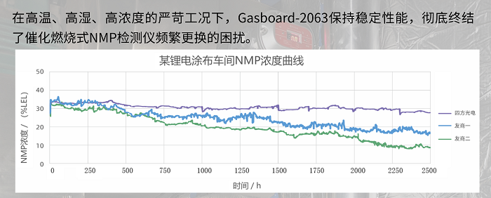 国内某锂电池涂布车间,连续三个月的实测数据显示,四方光电NMP检测器运行稳定,实现免维护、无衰减、无中毒;而另外两家友商的催化燃烧式检测器,已出现明显衰减,测试数据偏差达到50%以上。